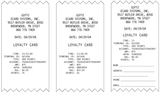 Sample receipts shown below for an Auto Rewards program set up with the following